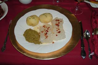 מאכל טיפוסי מדג בקלה מיובש לוטפיסק Lutefisk מוגש בד"כ עם אפונה,חרדל ותפוחי אדמה.