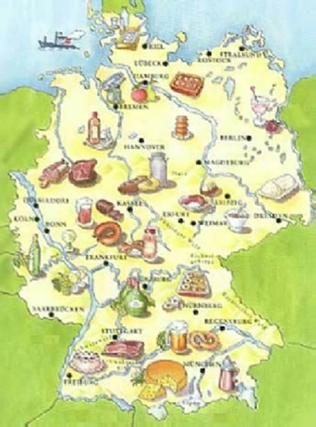 באזור Bavaria ו Hessen , המטבח מאופיין בהרבה בירה, מוצרי חלב. Spannferkel נקניקיות קטנות של חזיר, Handkaesמעין תערובות גבינה מוגשות עם שמנת חמוצה, Schwaebische Kasespaetzle כופתאות בצק מקושטות בחמאה וגבינה.