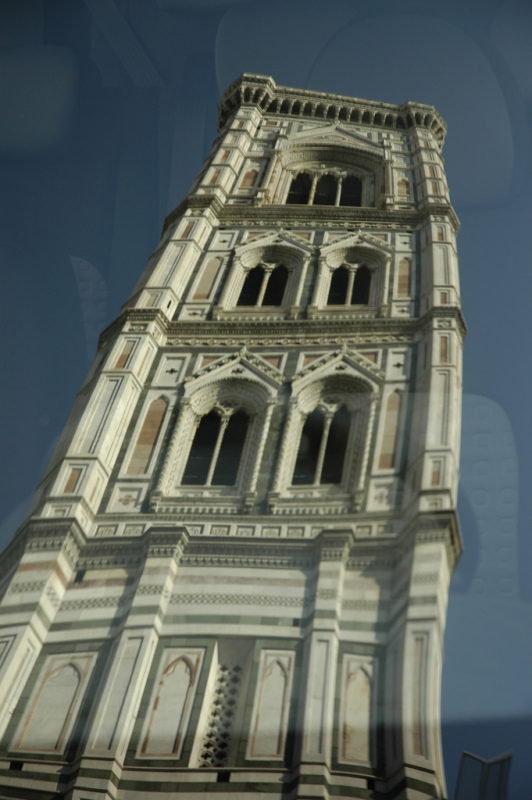המגדל מצופה בשיש אחד היפים מסוגו באיטליה. מתנוסס לגובה של 82 מטר תוכנן ב1334 בידי ג'יוטו. בשעתו הארכיטקט הראשי של פירנצה. הושלם ב1378.בניגוד לעגלגלות של כיפת הדומו, המגדל הוא אנכי וקוויו ישרים.בית הטבילה – Battistero