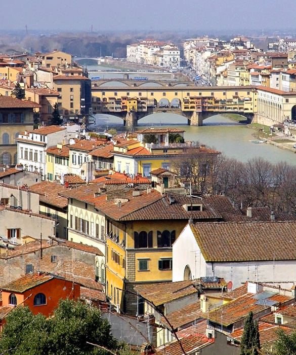 הגשר הישן (וקיו משמעו ישן) של העיר כמובן שהוא הגשר העתיק ביותר בפירנצה, ומשמש גם כסמלה הברור. הגשר הראשון נבנה מעץ ב1345 על שרידי גשר רומאי. הגשרים המקוריים נבנו כמובן במקום שבו נהר הארנו היה הצר ביותר. יחד עם זאת, הנהר הציף את הגשרים פעמים רבות ואף הרס אותם. בבניה המקורית של הגשר נבנו מבני חנויות ומעבר בין ארמון פיטי לארמון ווקיו.