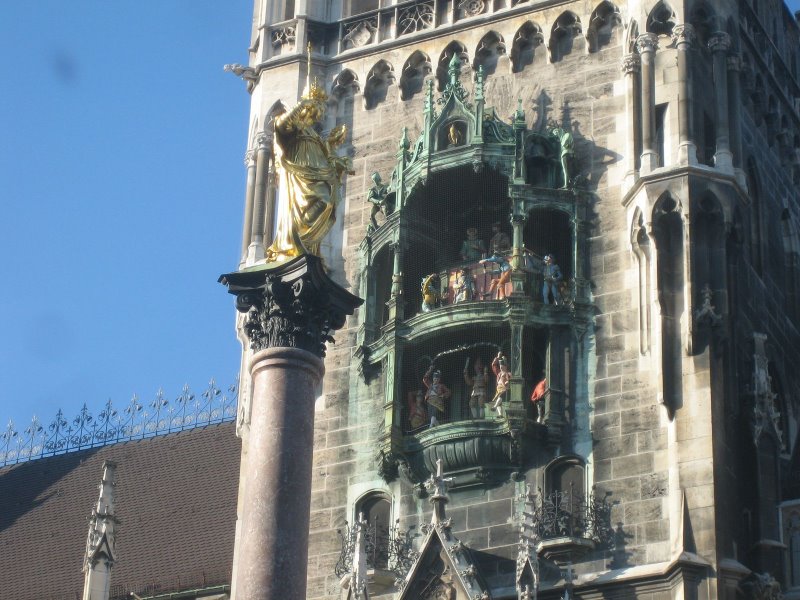 מתחת לפעמונים שקשה מאד לראות ממבט מלמטה, גם כאשר מטים את הצוואר עד נקע- נמצא השעון המכאני Glockenspiel (הגדול ביותר בגרמניה) מנגן בשעות שונות ביממה בד"כ ב11.00 ו 12.00 ו 17.00 ואז יוצאות גם דמויות מחלון המגדל. וכולם מסתכלים.