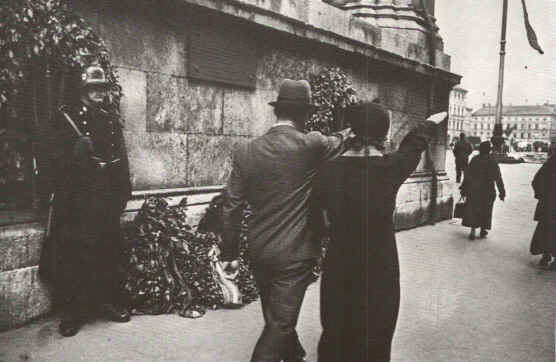 תמונה נדירה של זוג אזרחים גרמניים מצדיעים במועל יד בשעה שהם עוברים ליד אנדרטה לחייל הגרמני.